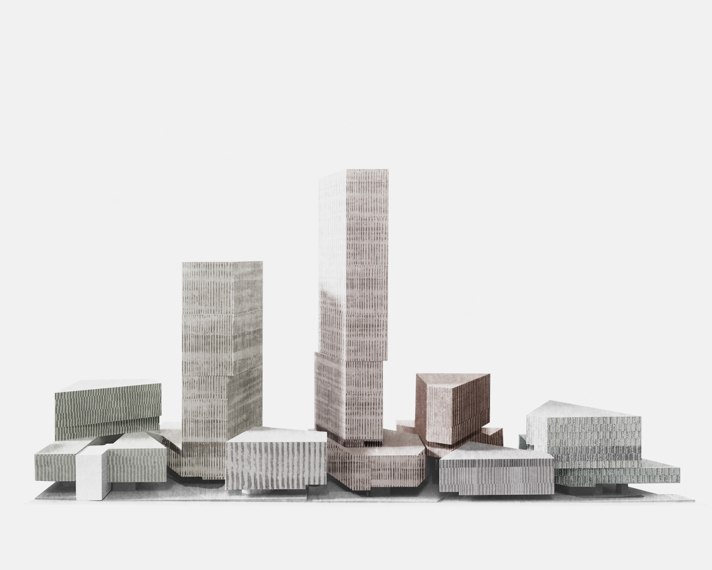 Competition proposal for a mixed-used highrise at Alexanderplatz, Berlin. The proposal challenges the 1980s masterplan by Hans Kollhoff.