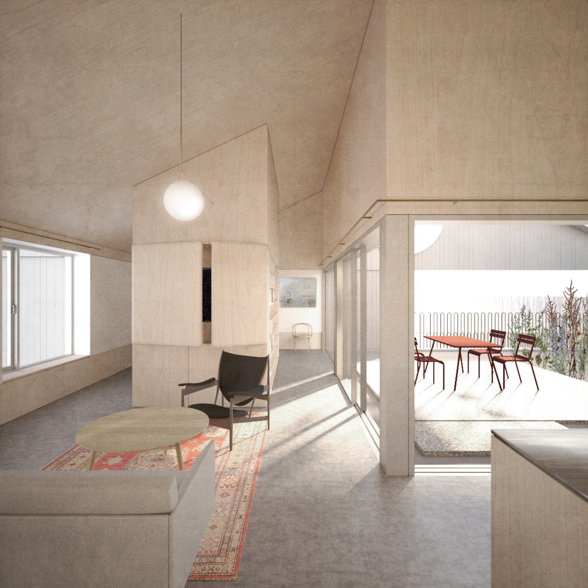 Project is a complex of three single family houses connected together. Living spaces wrap around atriums to provide privacy.