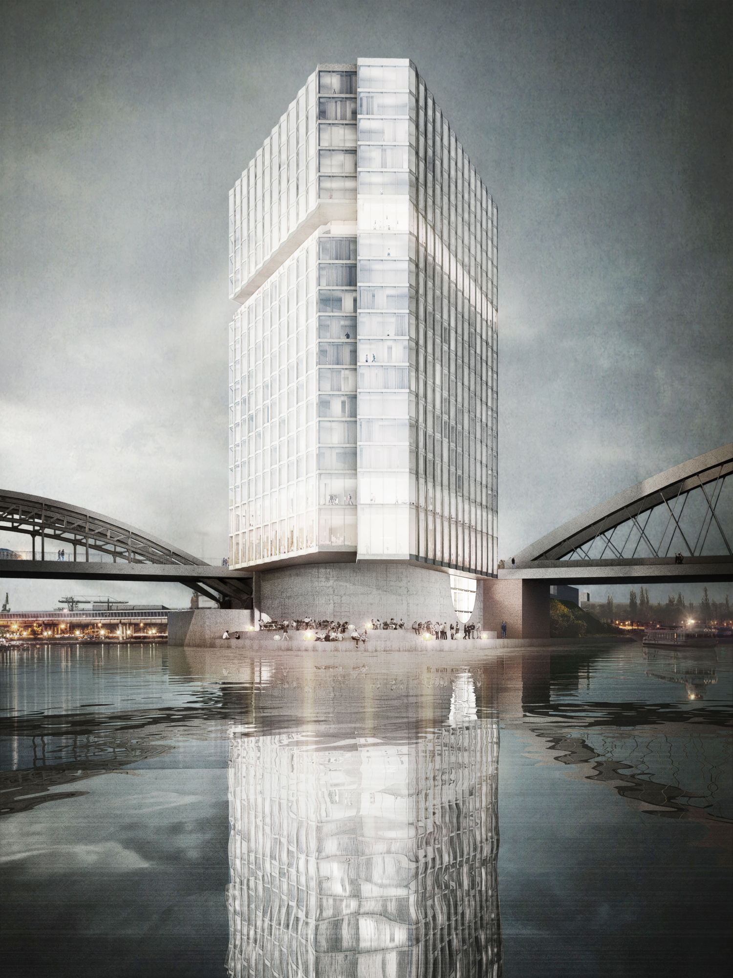 First Prize in a competition for a hotel at a prominent waterfront site in Frankfurt.